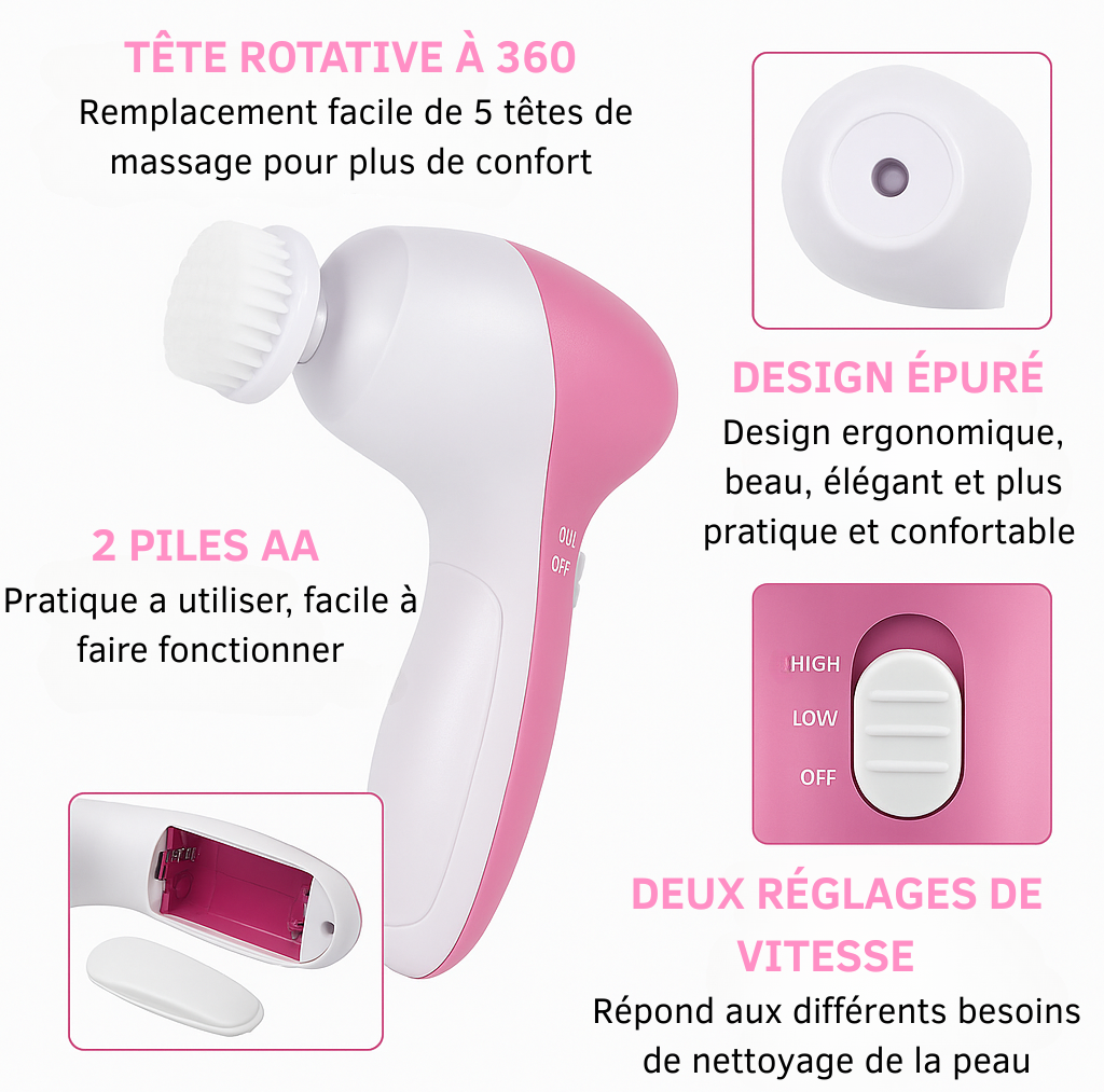 5 têtes interchangeables pour nettoyer, exfolier, masser et sublimer votre peau en un seul appareil. - 2 vitesses réglables (High/Low)
