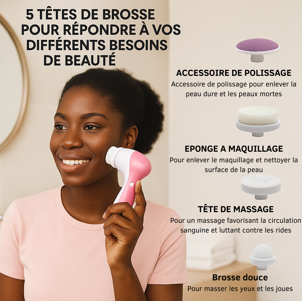 Révélez une peau douce, éclatante et purifiée grâce à notre brosse nettoyante visage 5 en 1 SoftGlow— votre alliée beauté pour une peau impeccable au quotidien.